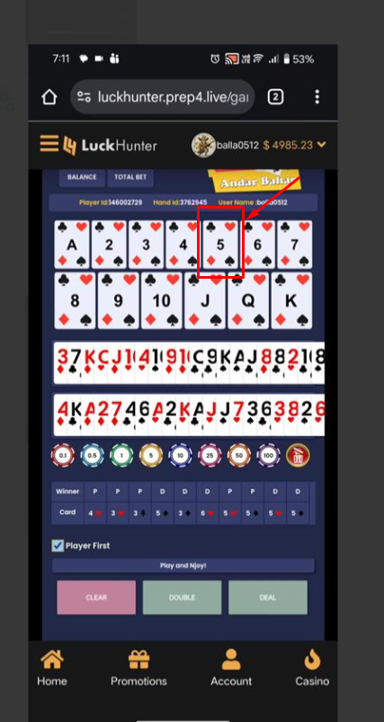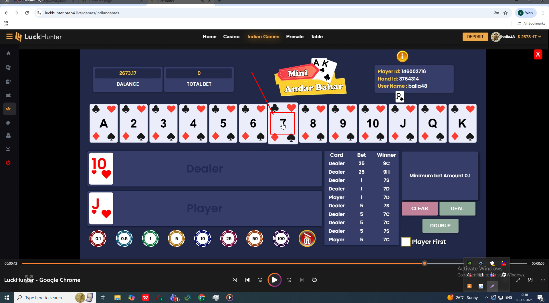 Mini andar and bahar while cards dealt,select trash button click on bet number ,chip cleared.