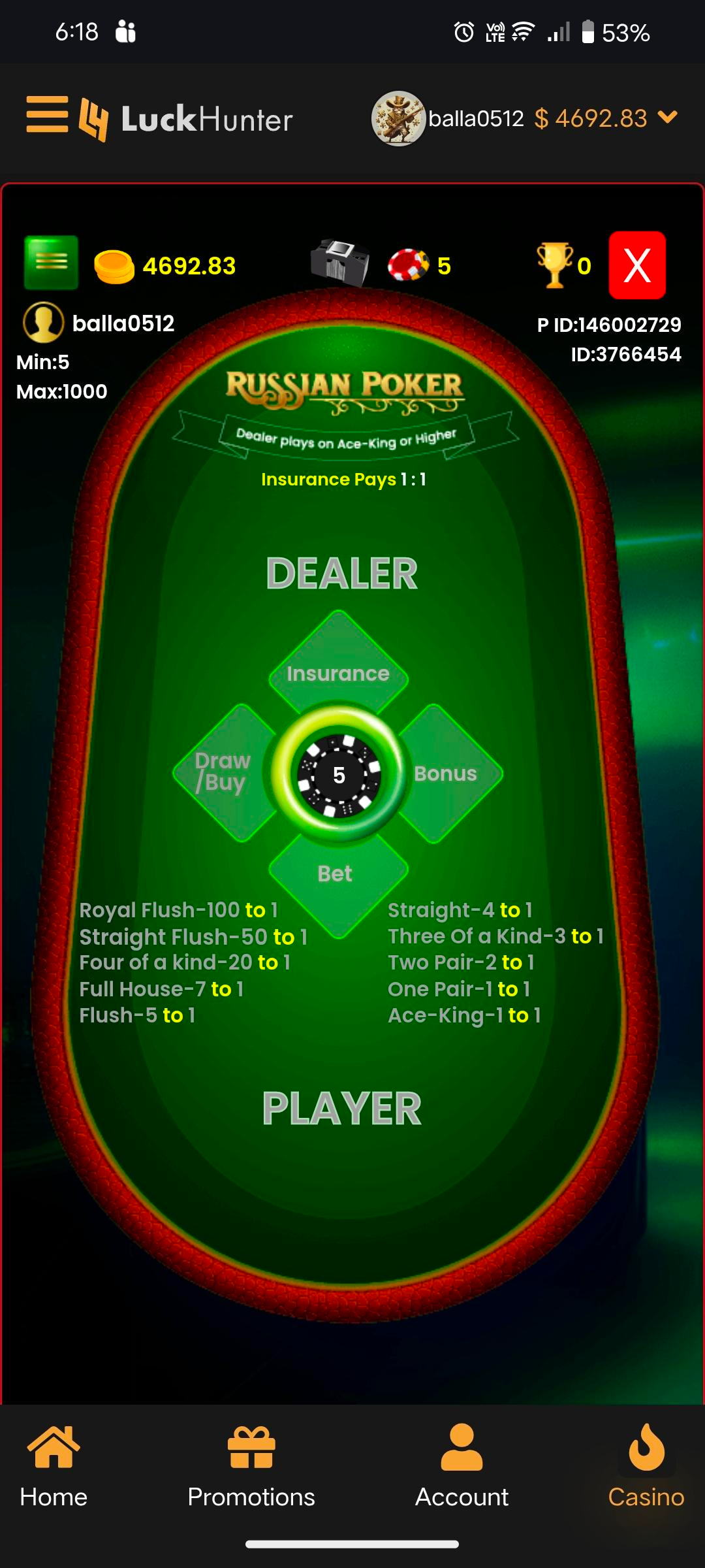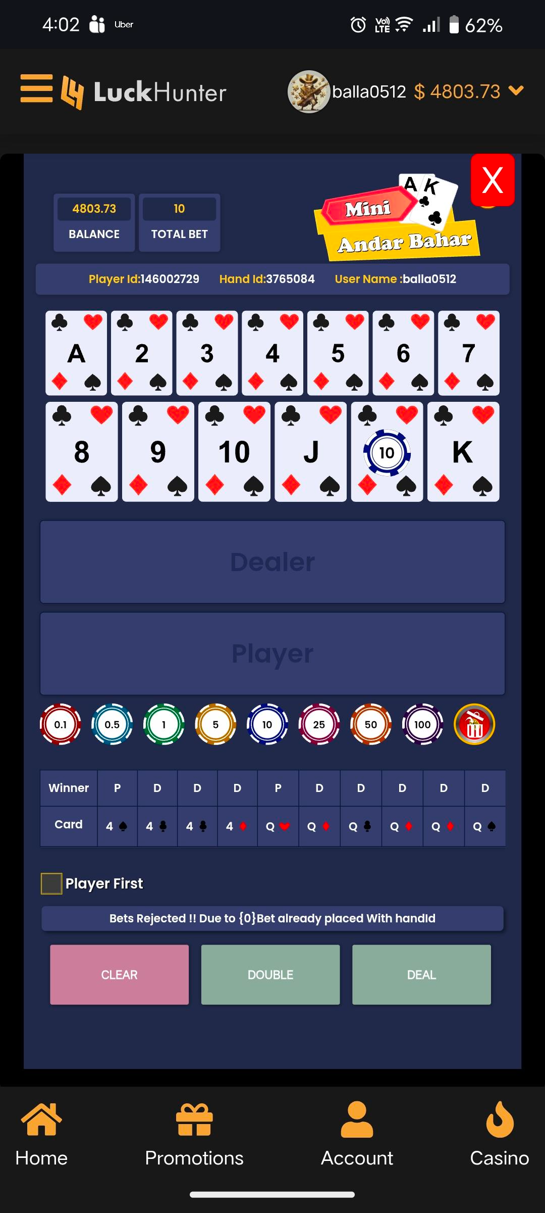 bets are rejected in games ,(observed in Mini andar-bahar and Russian poker.)