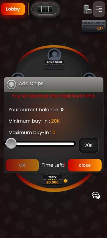 Once player buy maximum limit of chips in table while playing ,show message "you reached maximum limit to this table".